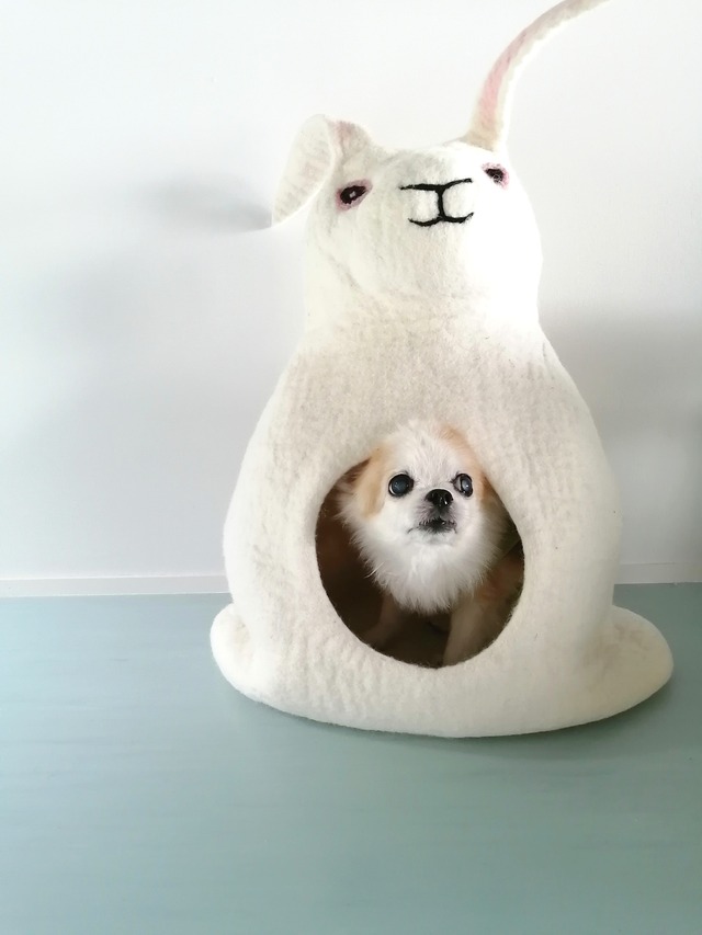 犬、猫、うさぎ、フェレット等マルチなペットのためのカマクラ型寝床です。 羊毛フェルト製 サイズ 高さ 57cm 幅 40cm 奥行き 30cm 穴の直径 20cm ◎フェルトの特製◎ 冷たい外気を防いでくいれます。湿気を吸うと「吸着熱」を発生してあったかいのです。吸湿力が高く、外部の湿度に応じて湿度(水蒸気)を吸ったり、放出したりします。 表面のキューティクルは水滴をはじく性質があり、水溶性の汚れは中まで染み込みにくいです。 汚れたときは、水洗い自然乾燥してください。 ※手作りのため完成形に微妙な個体差があります(画像3参照)品質に変わりはありませんのでお届けはアソートとなりますことご理解ください。 ※天然繊維のため植物などが混入し、表面に黒点が付着する場合があります。これは素材の特性であり製造工程で取り除くことは困難です。品質上は問題ございませんので、あらかじめご了承ください。
