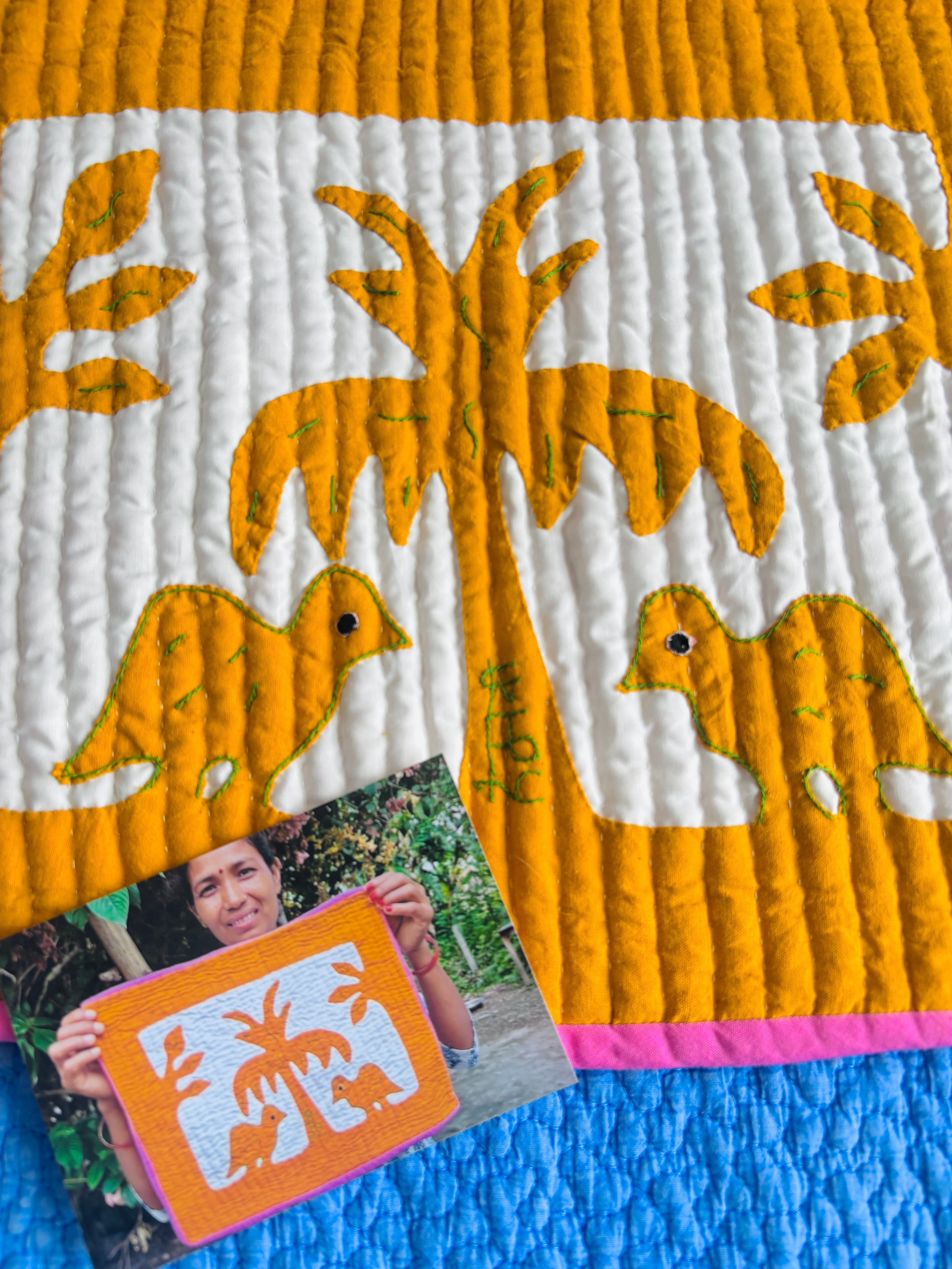 独創的なパッチワークの図案は、村の生き物たち。パッチワークにひと針ひと針キルティングを施された心温まる作品です。