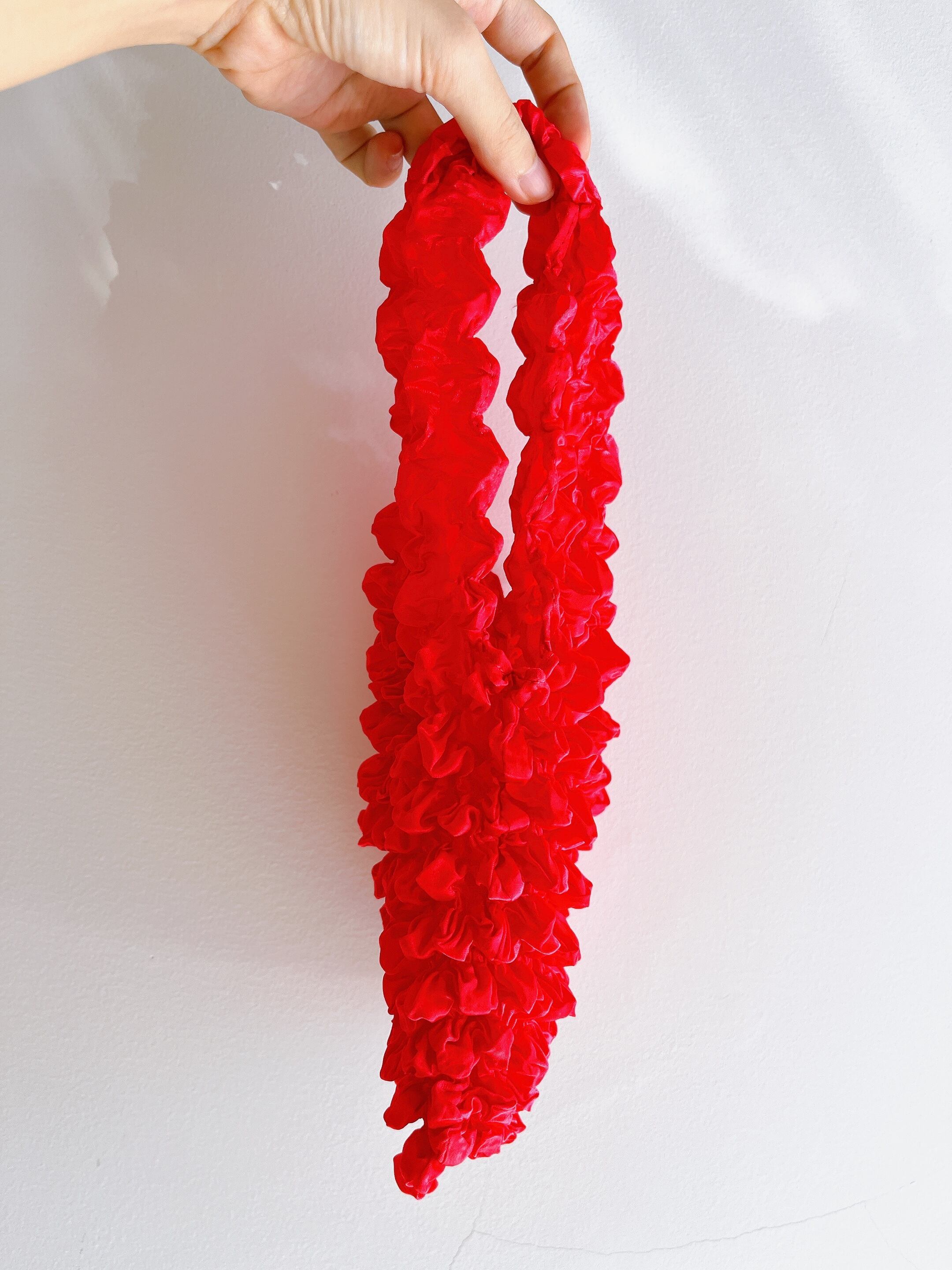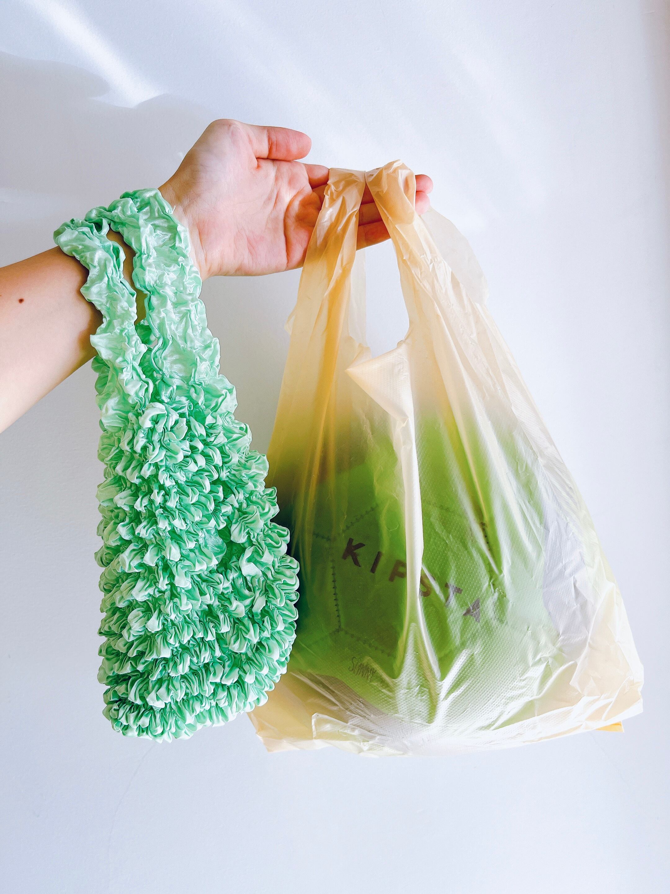 物を入れると膨らむ伸縮性のあるポリエステル生地のバッグです。持ち手も伸縮するので肩にかける事もできます。セカンドバッグとして常時持ち運ぶのにオススメです。