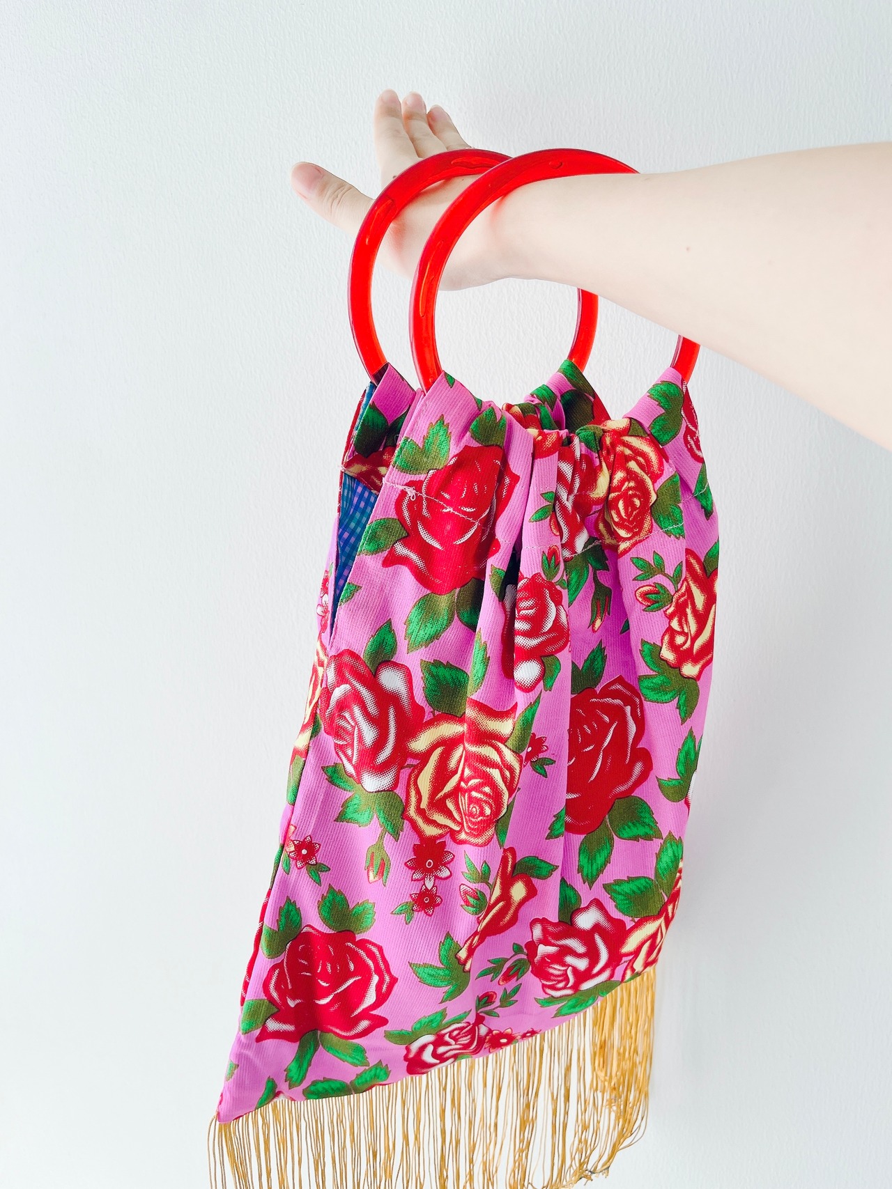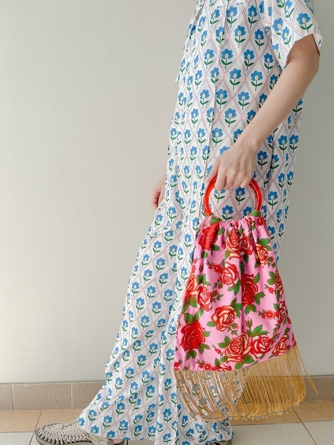 2024年新作はタイ山岳民族の布を使ったバッグです。制作はスラム街の女性自立支援団体を通じ、フェアトレードで縫製を依頼しています。
