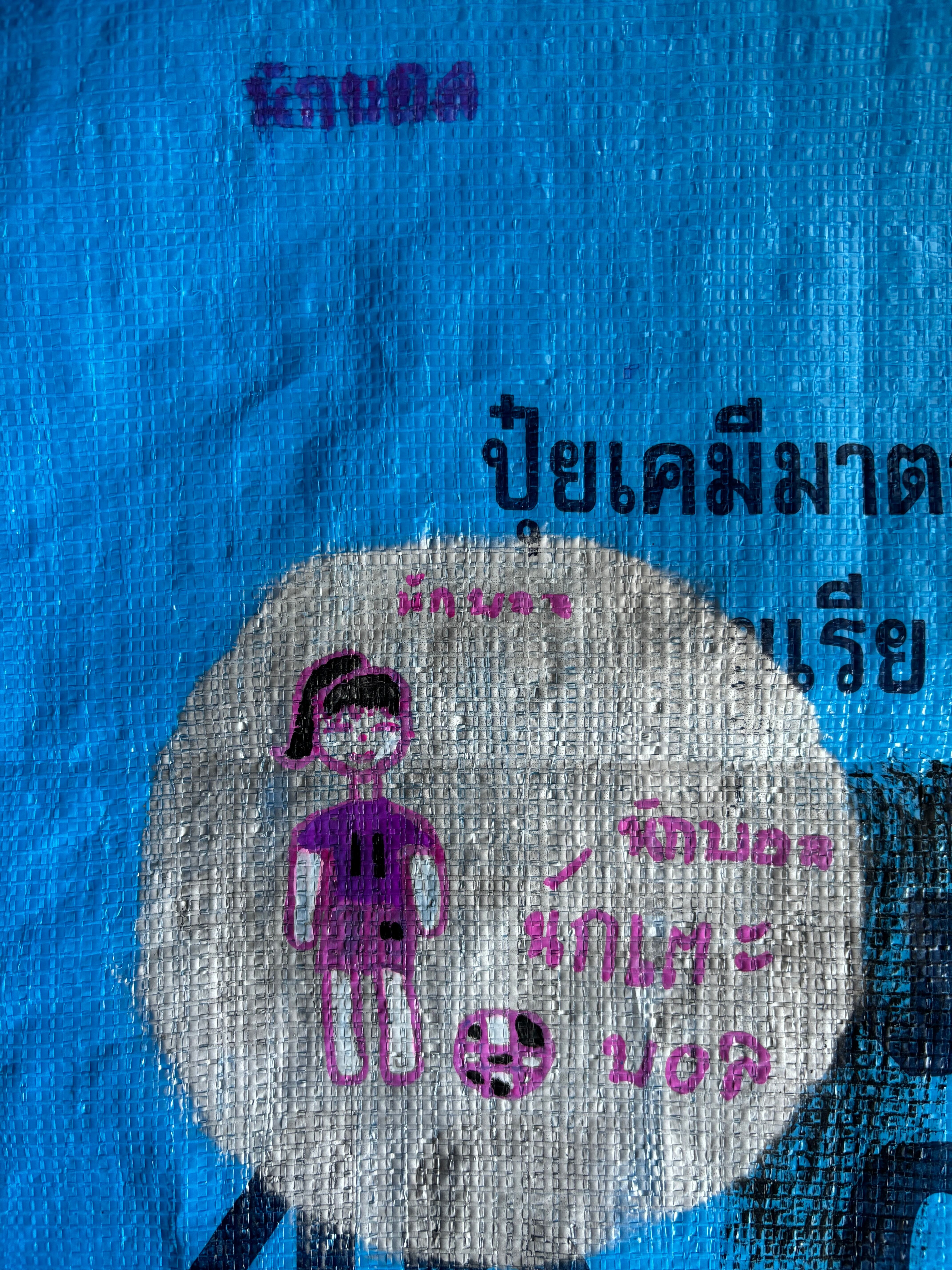 キャンバスとして使ったのは印刷ズレのある飼料袋で作られたプラスチック製のエコバッグです。